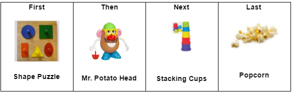 Here’s another example of a picture schedule, this one showing that three tasks (a puzzle, a Mr. Potato Head toy, and stacking cups) should be done. Then it will be time for popcorn!