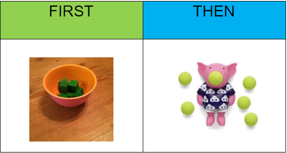 One way to let your child know what you want him to do is a First/Then board. Using a First/Then board, you can let your child know that something he likes or wants is coming, but he has to do something else first. Often, when children understand that they will soon get what they want, they are able to wait for it more patiently. Here’s an example of a First/Then board we made using pictures taken with an iPhone and Google Images. The message you are giving is: first put the blocks in a bowl and then we can play with the Pig Popper toy.