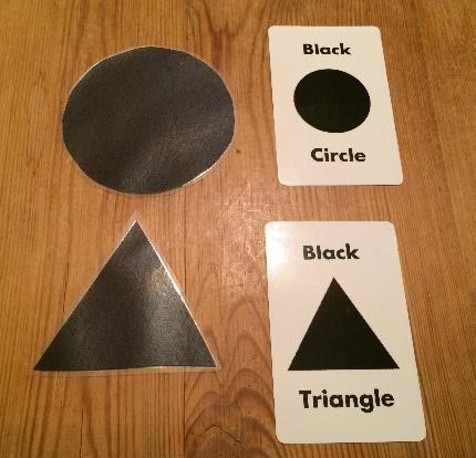 Cuando enseñe a su hijo las formas, siga el mismo enfoque que utilizó con las palabras para los objetos y los colores. Comience colocando tres tarjetas con formas o figuras recortadas sobre la mesa. Para evitar confusiones con los colores, puede utilizar formas completamente negras al principio. Estos son algunos ejemplos de materiales que puede utilizar: