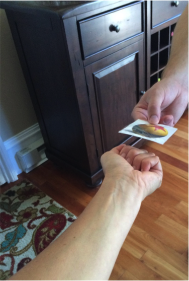 Here’s another thing to think about: So far in our discussion of PECS, we have not talked about eye contact. While eye contact should not initially be required as part of the PECS request, now is good time to begin working on it during PECS training. Be sure your child is consistently able to walk to his binder, remove a picture, walk across the room to you, and hand it to you in order to request an item that you have. Then you can begin to wait for eye contact before you accept the picture into your hand. Whenever your child is looking at you as he approaches, be sure to smile at him, accept the exchange quickly, and immediately hand him the item while labeling it. However, if he is not looking at you when he approaches you, look at his eyes while holding your arm outstretched but curl your fingers in, like this.